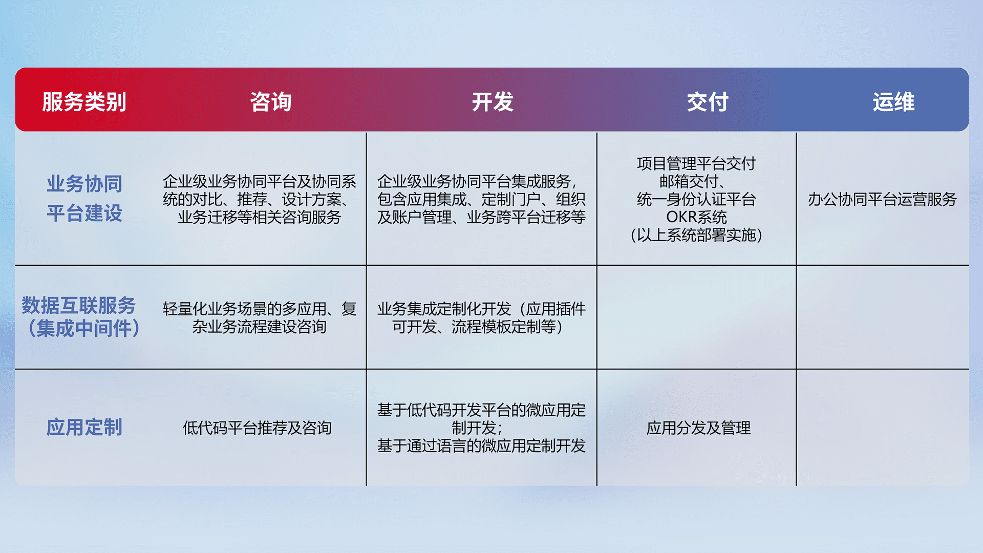 针对钉钉、、、企微、、IDaas等平台级产品提供产品的规划、、方案、、、、交付、、、定制化开发等服务,,,实现如统一协同办公、、、智能客户服务、、、、混合会议管理、、智能数据查询、、、、等业务场景,,,实现数字化转型。。。