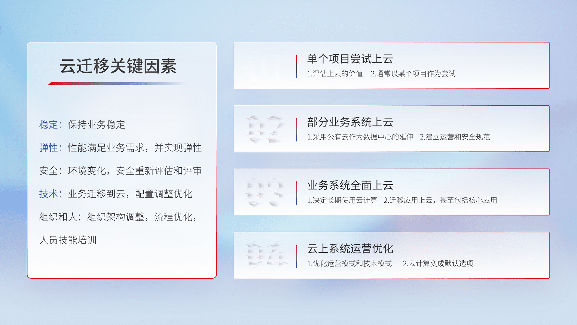 结合实际业务,,从规划设计、、、云平台选型、、、、云原生改造、、、、数据迁移、、、、集成交付,,迁移全过程为客户识别最佳上云路径,,,做好风险识别管理,,设计网络架构、、、、身份权限、、、、安全审计合规、、、操作审计、、、、日志审计、、、监控告警策略、、、、多站点容灾设计等,,对云上基础设施进行整体规划,,提升IT治理水平,,,,以满足弹性、、高可用、、高性能的需求。。。