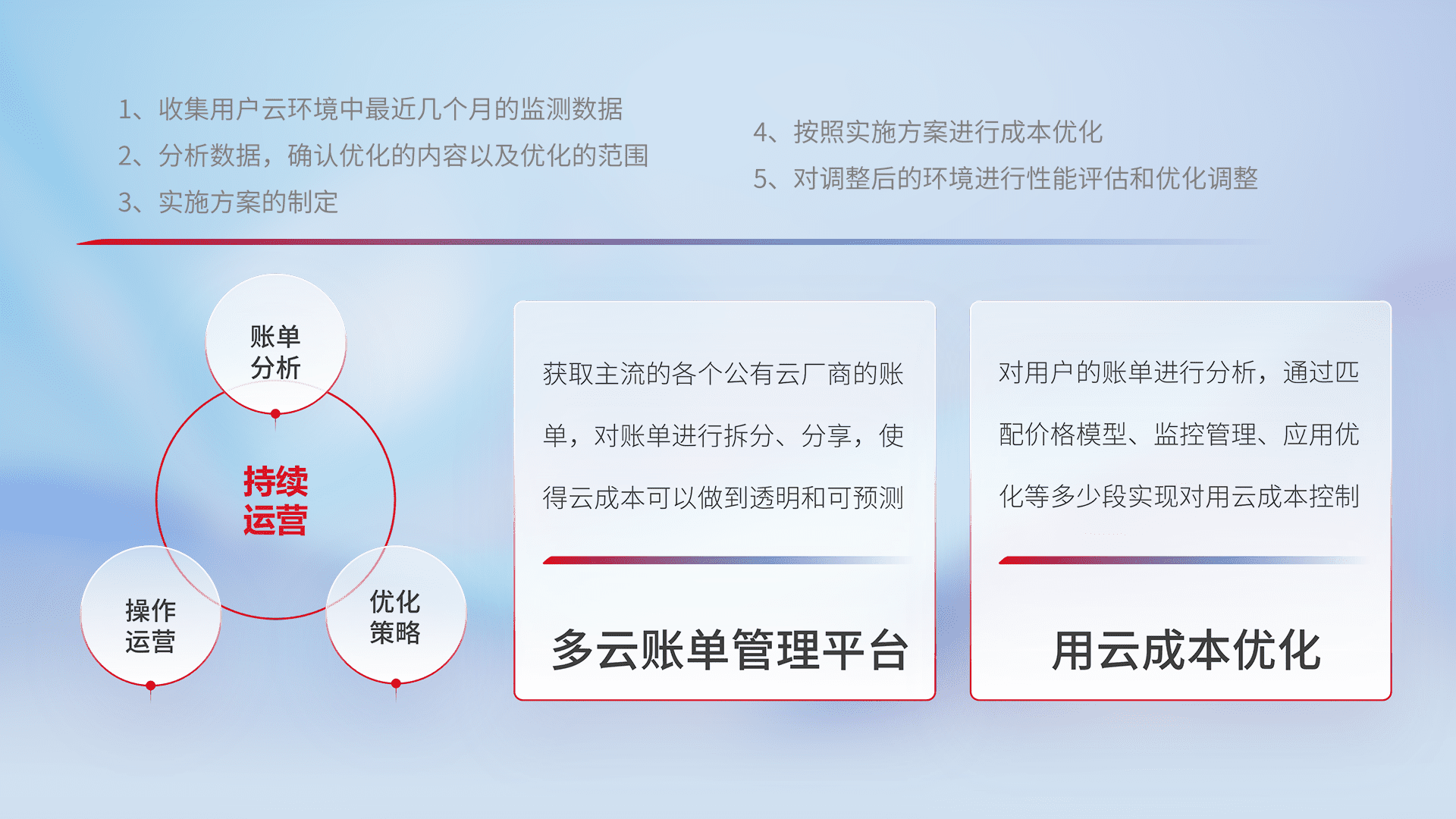 通过多云纳管,,,,以统一的资源数据模型把客户的云资源进行抽象和封装,,,进而实现对多云资源的统一操作,,保障云资源管理的可靠性、、、稳定性与可用性。。量身定制化运维内容,,配置、、开发运维、、、、补丁管理、、、备份、、、监控、、、认证和访问管理、、、、审计和日常巡检等,,,,保障在用云过程中的可靠度,,,稳定度以及高可用率。。