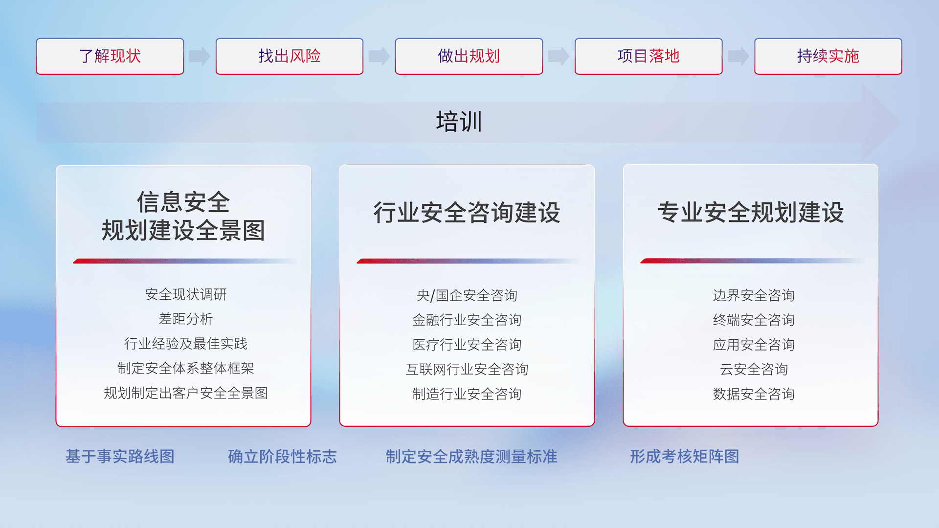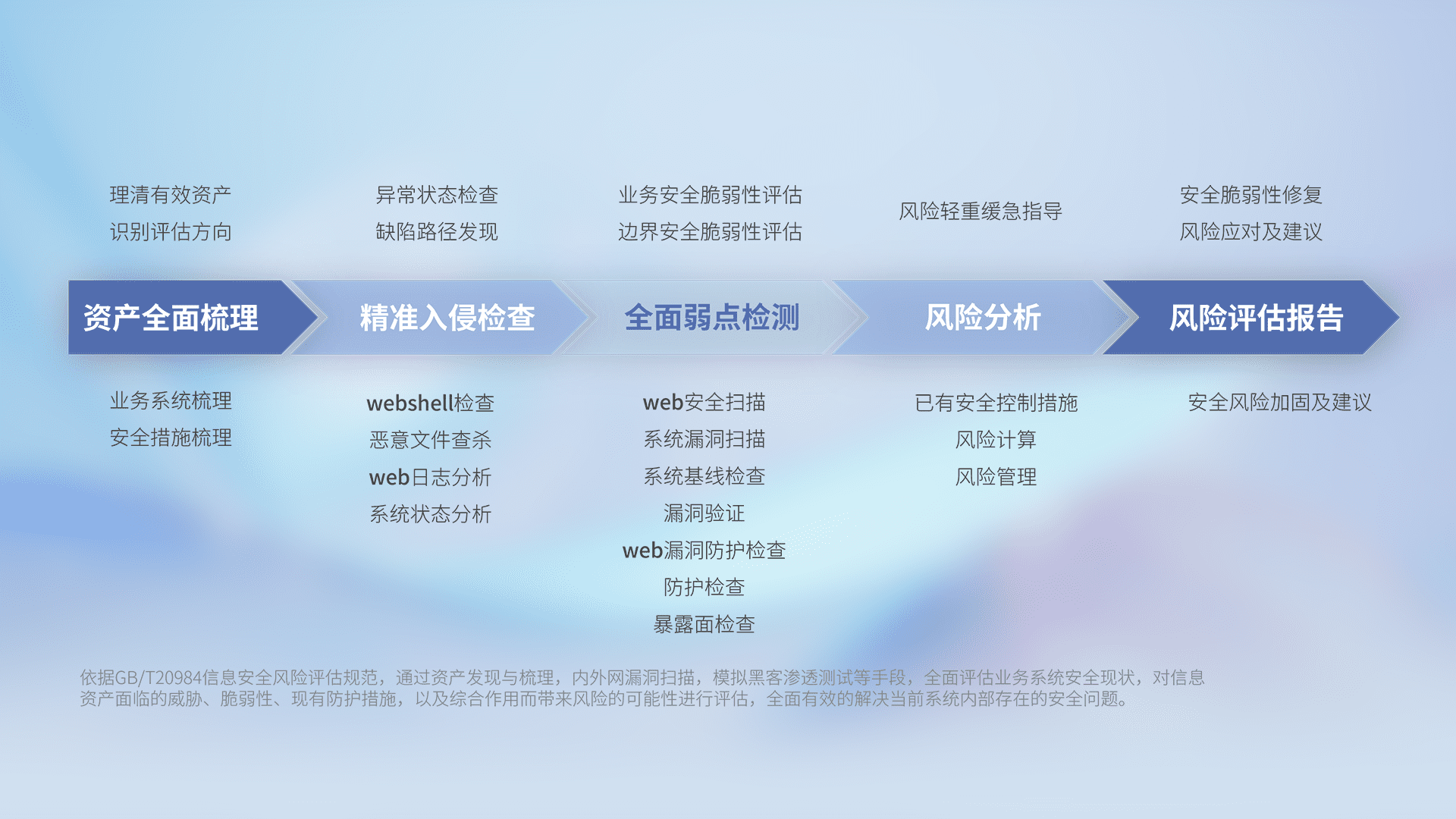 针对客户行业特性,,,,以专业的安全服务+多厂商联合解决方案提供专属的一站式安全管理服务,,,帮助客户全面感知网络空间威胁,,,基于识别、、、、检测、、、、分析、、、、防护、、、监测、、、、响应的服务理论模型,,从方案咨询、、集成交付、、、评估验证、、、、优化加固、、、、运维运营,,,,致力于为客户提供完整的闭环管理式安全服务。。。。以实战经验为客户打造高抵御风险的安全体系,,帮助客户发现威胁、、、对抗威胁、、、、处置威胁,,,不断积累安全对抗能力,,,持续保障数字化安全。。。。